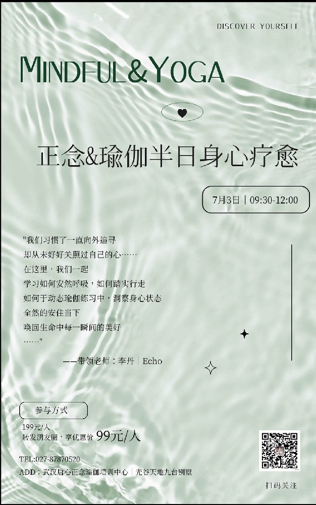 正念瑜伽半日身心疗愈课程7月3日开讲,在这里,我们一起学习如何安然呼吸,如何踏实行走,如何于动态瑜伽练习中,洞察身心状态,安然的安住当下...